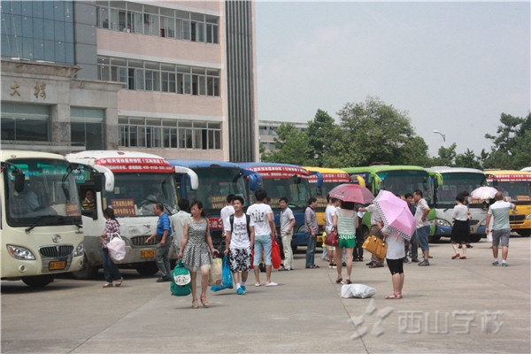 每年此时,江西省西山学校都以“家长”自居,为孩子们送别。中午2时许,20辆大巴满载考生依次驶出校门,载着406名高三学子奔向高考考场,夹道欢送的人群让安静的校园沸腾不已,同学们大声喊着“西山必胜、高三加油”!