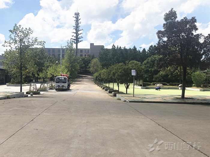 阳光下的洒水车从早上5点30分到晚上9点,一天五次不间断的为同学降温消暑、灭蚊消虫。